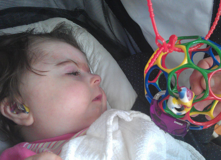 Neeeeiiiiin, keine Sorge, der Mausbeere ist nichts passiert! Es hat lediglich eine kleine drollige Begebenheit gegeben, als Oma Anne das Kind in die Karre gesetzt hat. Dabei hat sich das eine Hörgerät der Beere am Karren-Balli verhakt und ist einfach - aber sehr kunstvoll - dran hängengeblieben. Die verdutzte Mama musste das natürlich gleich wieder im Foto festhalten: